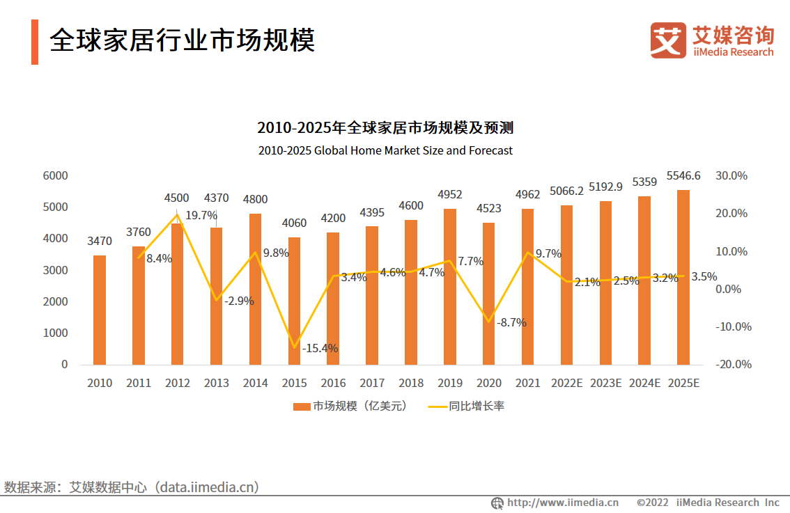 全球家居行业虽然受到疫情影响,但其市场规模上升空间大,各品牌可以创新性推出新产品,抢占市场份额。2010-2025年全球家居市场规模呈现波动上升的趋势,2021年,全球家...