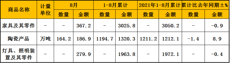 日前,海关总署公布2022年8月全国出口重点商品量值表(人民币值)最新数据。8月份,中国家具...