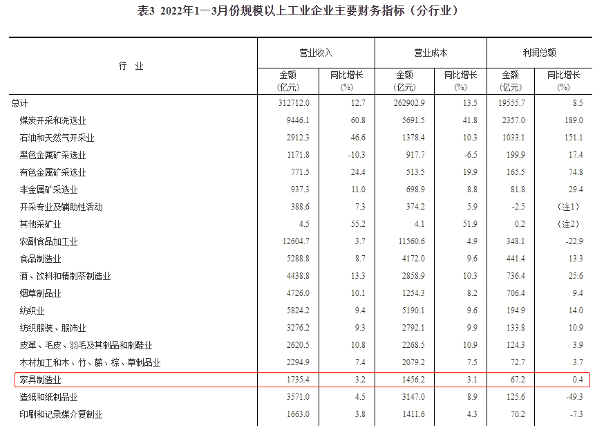国家统计局:2022年一季度家具行业亏损面28.7%